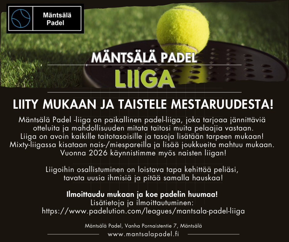 Lisätietoja ja ilmoittautuminen: https://www.padelution.com/leagues/mantsala-padel-liiga